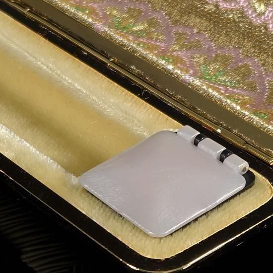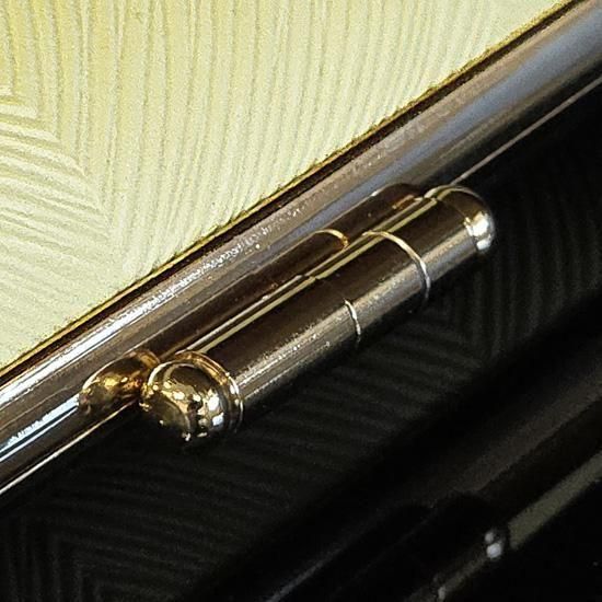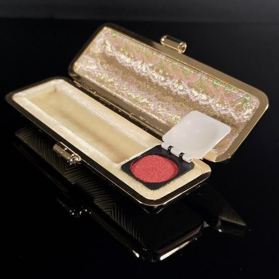 手になじみやすい独特の手触りと、華やかなゴールドメッキフレームで上品なイメージを醸し出します。印鑑収納部は、外面に合わせた色になります。