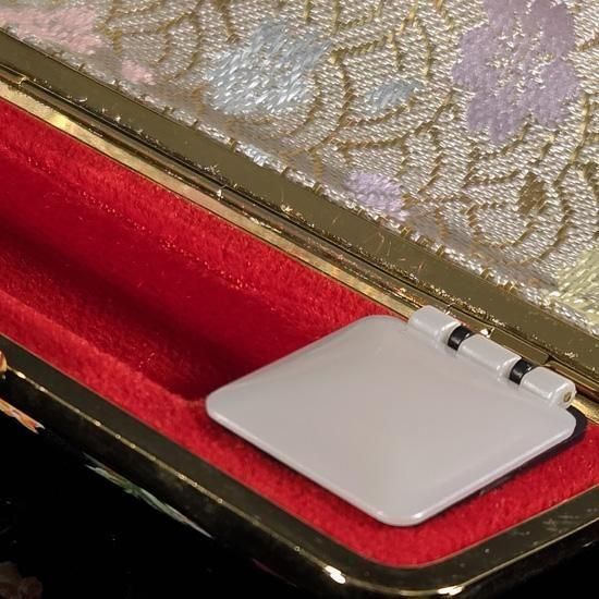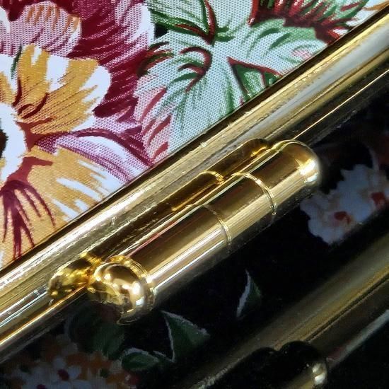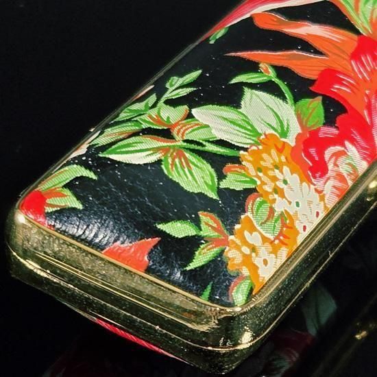 表素材にビニールレザーやスエードなどを使用し独特な手触りに仕上げ、ゴールドフレームがさらに質感を高めます。
